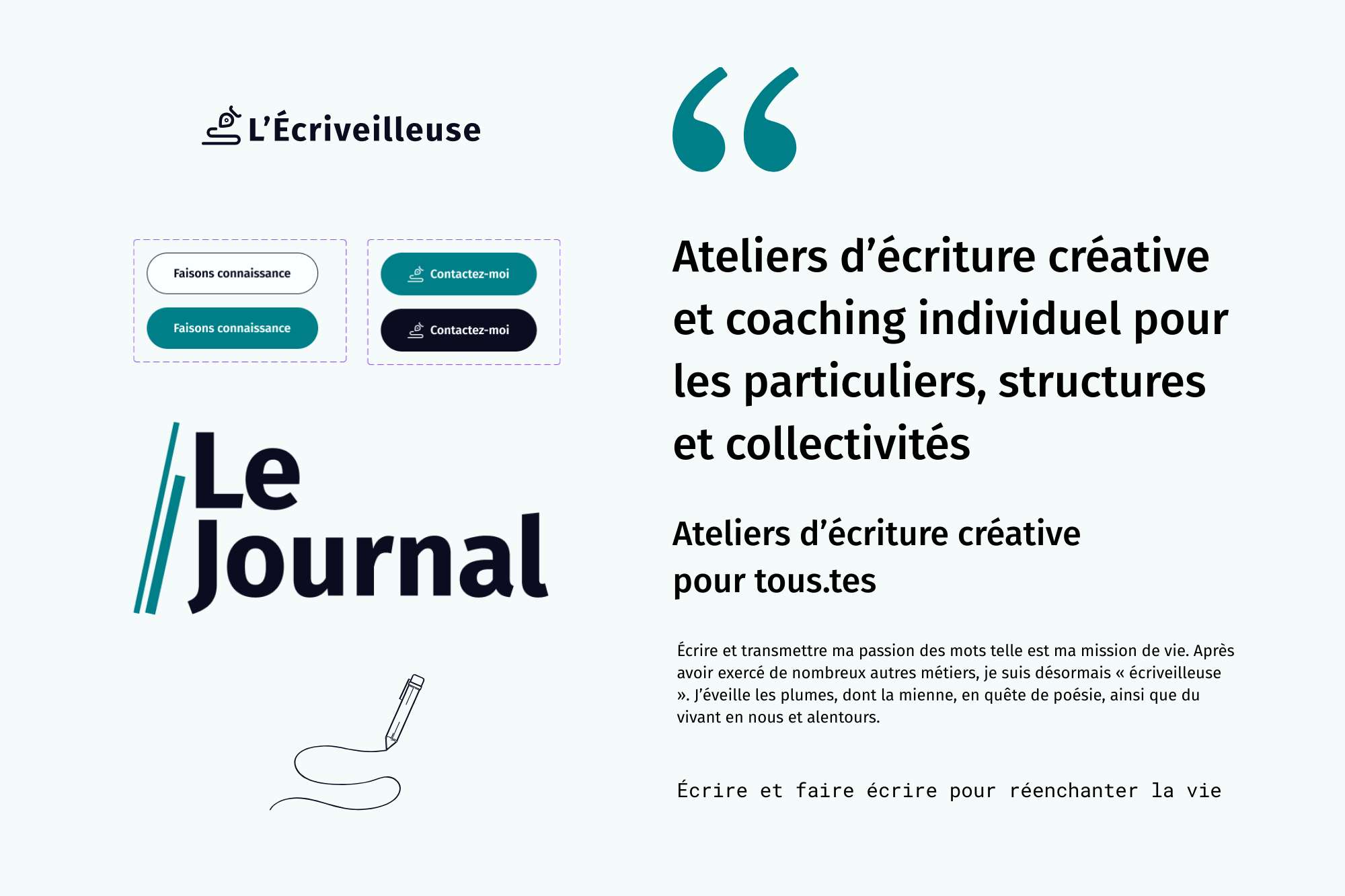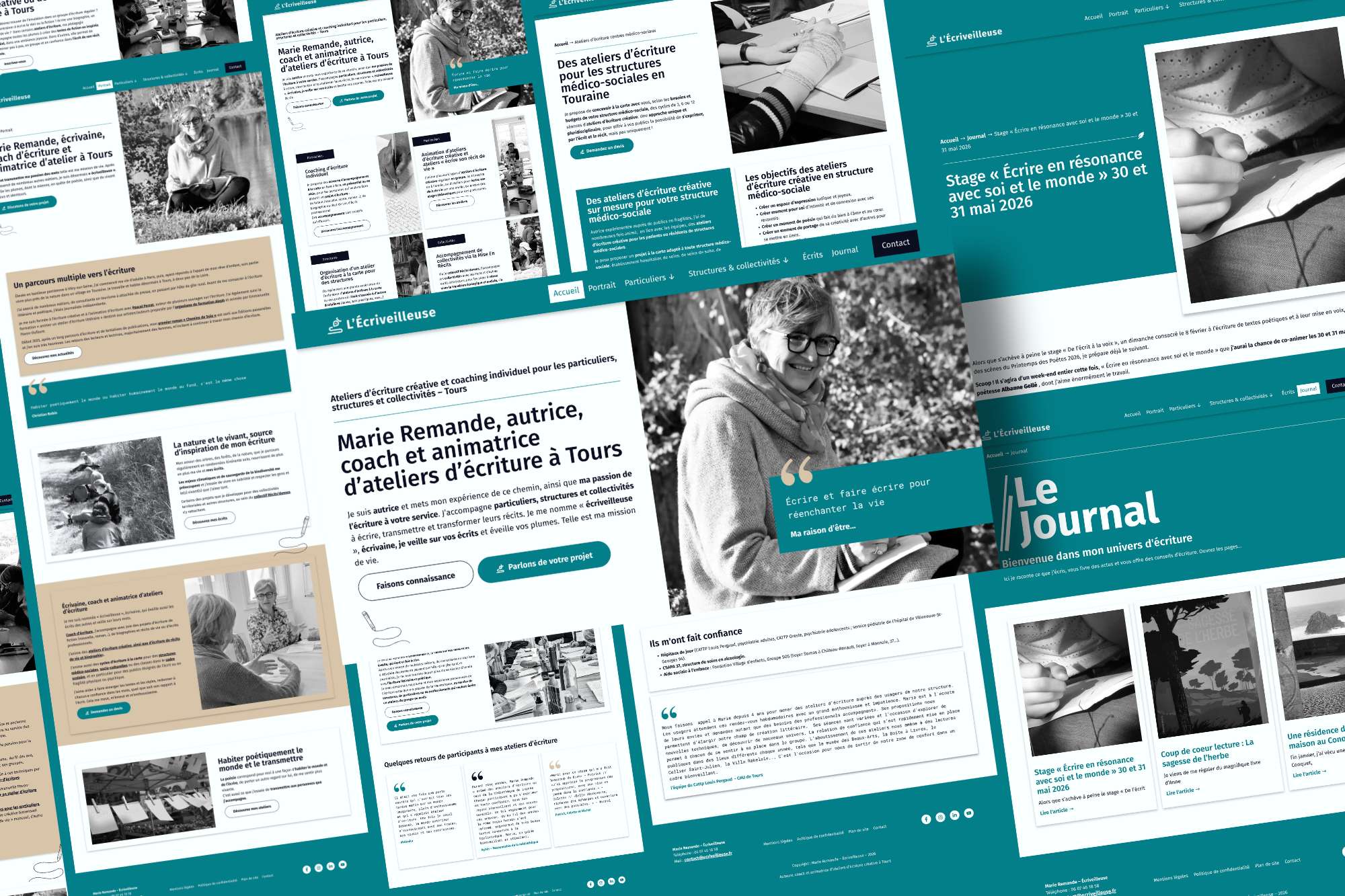 Comme pour un manuscrit, nous avons travaillé par étapes : structuration de l’arborescence, harmonisation éditoriale des textes pour restituer la voix singulière de Marie, conception d’un univers visuel doux et lumineux, et optimisation de l’expérience utilisateur (parcours de contact, navigation mobile, bases du référencement naturel). Chaque page a été pensée comme un chapitre d’une histoire cohérente. Le résultat : un espace digital qui n’en fait pas trop, mais fait juste — et qui invite à écrire.